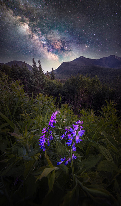 The White Mountains are one of the most spectacular places to photograph the Milky Way in the Northeastern United States. Towering peaks, dramatic ridges, quiet valleys, and pristine lakes create a magical setting to capture the night sky. In July, the region comes alive with lush greenery and, depending on the season, colorful wildflowers that add another layer of beauty to the landscapes.